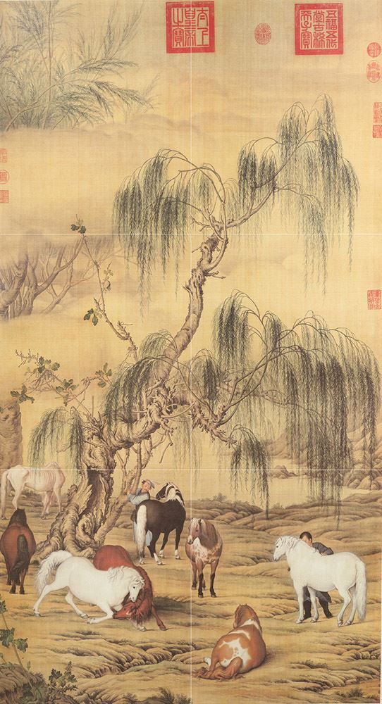 郎世宁来华初期,雍正年间(1723-1735)的作品。采用中国传统的颜料来作画,但在马匹、人物和柳树的表现上,却融入了西画著重光影的手法,显得立体感十足,以中国文字最美的仿宋体书在右下角签名。将西方文艺复兴的透视美学融入中国传统的水墨画,色彩明暗聚焦透视的艺术手法,成为宫廷绘画的经典。八骏图,在一棵壮实粗大的柳树下,在境界秀丽视野开阔的环境中,画着色彩不同的八匹骏马,神态各异造型逼真色彩外貌十分准确生动无不栩栩如生。