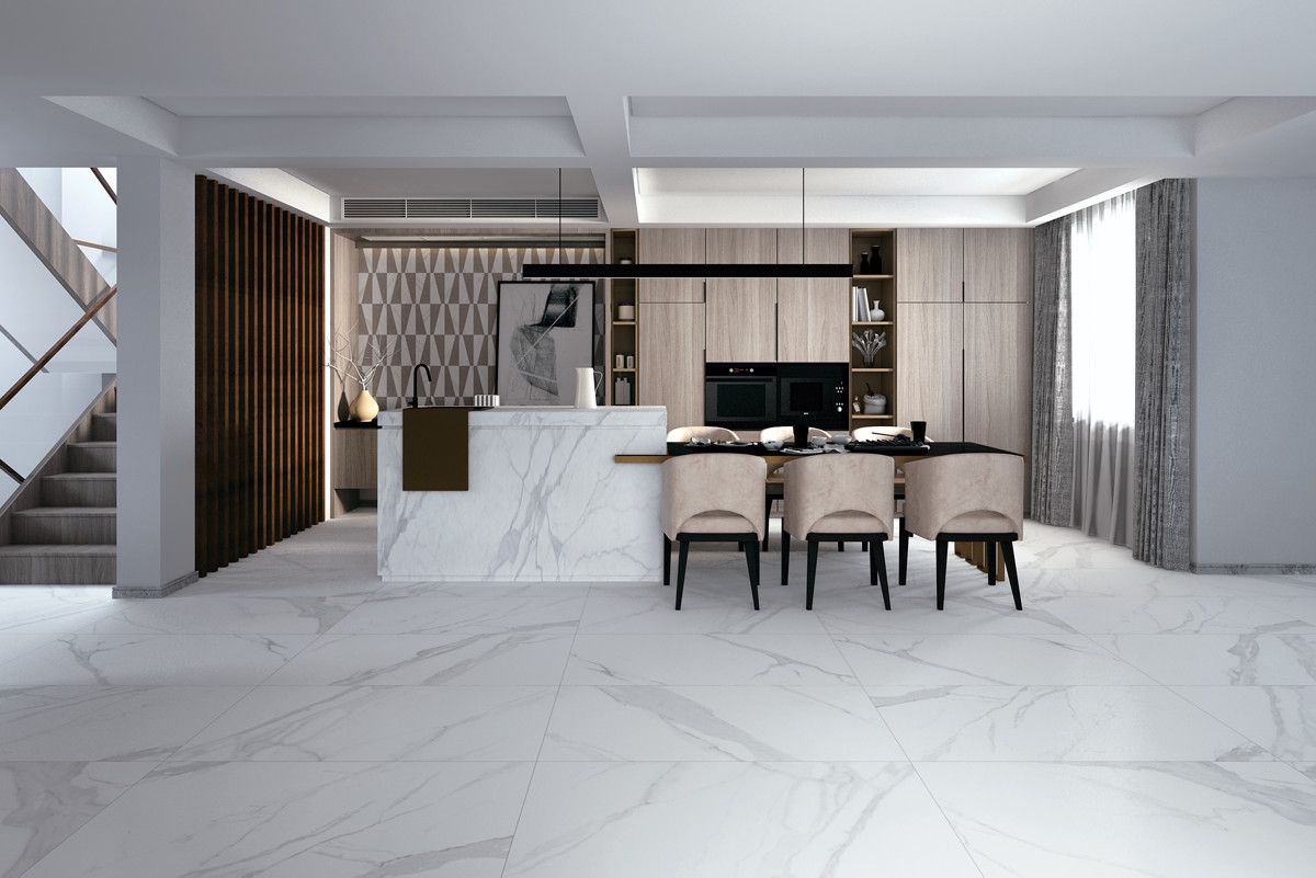 源自意大利著名石材鱼肚白,白里透灰,粗细相间,无限灵动与优雅在方寸间温柔呈现,轻松营造空间的纯净与沁人心脾的静谧。